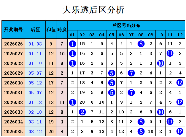 上期回来:大乐透第2026035期奖号为:前区02、22、30、33、34,后区08、12,前区奖号012路比为2:2:1,奇偶比为1:4,后区开出2路、0路组合08、12