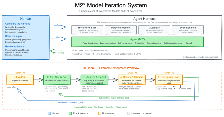 三周前,MiniMax M2.7上线。M2.7开启了模子的自我进化,是业界第一个AI深度参与迭代我方的模子。M2.7大略自行构建复杂Agent Harness,并基于Agent Teams、复杂Skills、Tool Search tool等智商,完成高度复杂的分娩力任务。