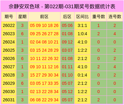 连号分析:上期前区未开出连号,最近10期中有6期开出连号,出现概率为60.00%,总体走势较热。本期展望会出现连号,参考1组连号:30,31。