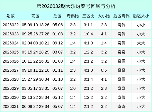 大乐透第26031期开出奖号:06、08、22、29、34 + 05、07。其中前区号码三区比为2:1:2,奇偶比为1:4,大小比为3:2,后区开迥殊数+奇数、少许+大数。