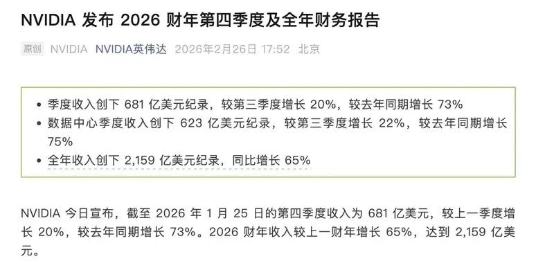 NVIDIA(英伟达)当天文书,限制2026年1月25日的第四季度收入为681亿好意思元,较上一季度增长20%,较客岁同期增长73%。2026财年收入较上一财年增长65%,达到2159亿好意思元。收获于NVIDIA援救驾驶平台的执续行使,第四季度汽车收入为6.04亿好意思元,较上一季度增长2%,较客岁同期增长6%。全年收入增长39%,达到创记录的23亿好意思元。