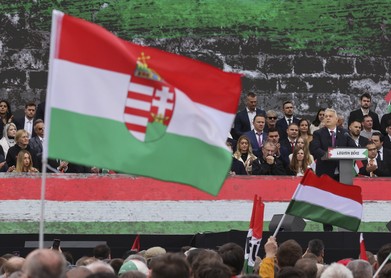 2025年10月23日,匈牙利总理欧尔班(前右)在都门布达佩斯举行的一场邻接上讲话。