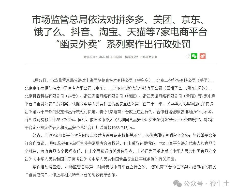 4月17日音讯,阛阓监管总局照章对拼多多、好意思团、京东、淘宝闪购、抖音、淘宝、天猫等7家电商平台幽魂外卖系列案,依据《中华东说念主民共和国食物安全法》第一百三十一条、《中华东说念主民共和国电子商务法》第八十三条的法例作出行政处罚决定,责令7家电商平台改正违警活动,暂停新增蛋糕店铺3至9个月不等,并处以罚没款共计35.97亿元。